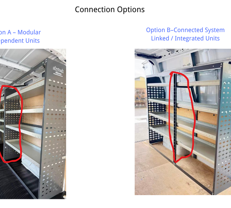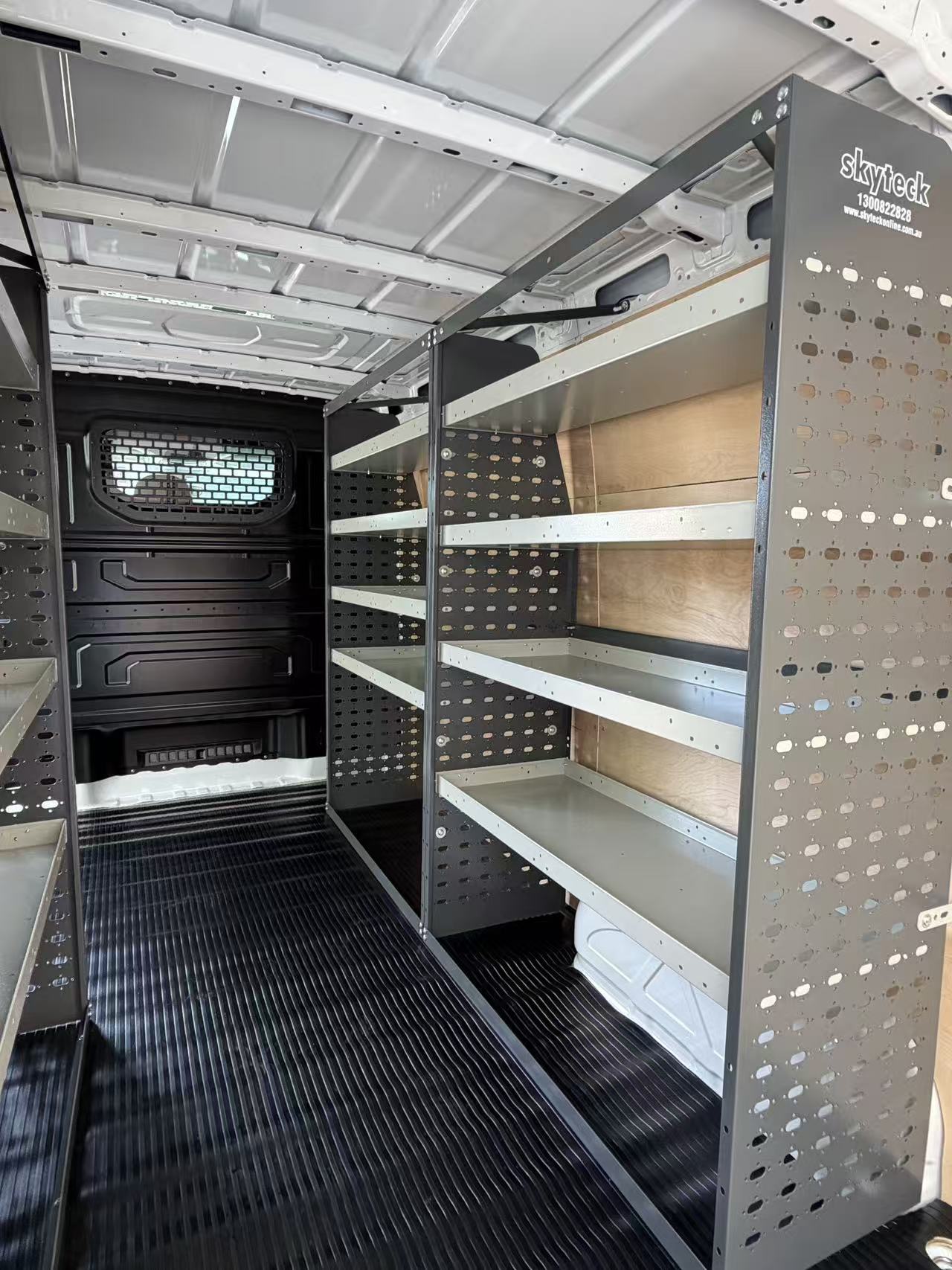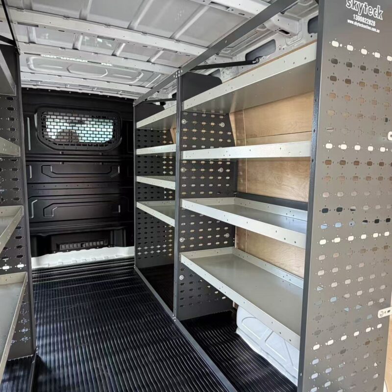 Perfect fit for Transit High Roof, ProMaster High Roof, and Sprinter High Roof. Creates a full left-and-right wall storage system.