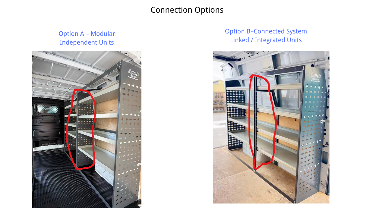 Note: Two connection options available – Option A (Modular, independent) or Option B (Connected, for long materials, using a center post).