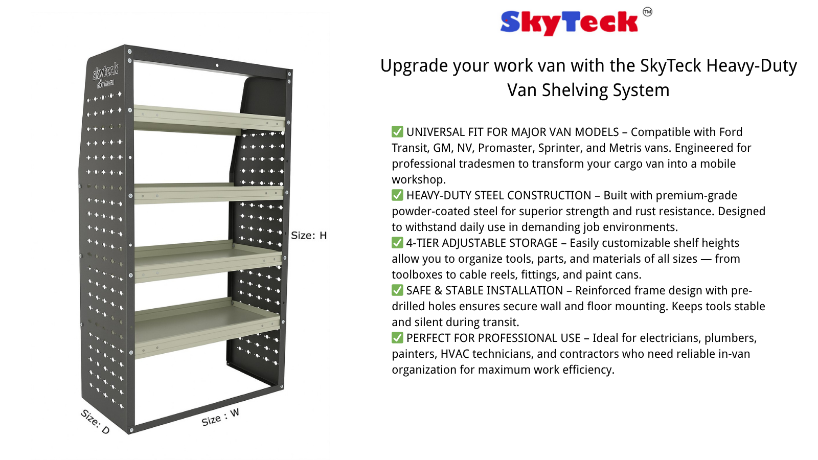 NVS008,SkyTeck Van Shelving System – Heavy-Duty 4-Tier Steel Rack Organizer for Work Vans | Fits Ford Transit, Promaster, Sprinter, NV, GM, Metris | Professional Storage for Electricians & Contractors-Size:49.6″W x 48″H x 16.5″D