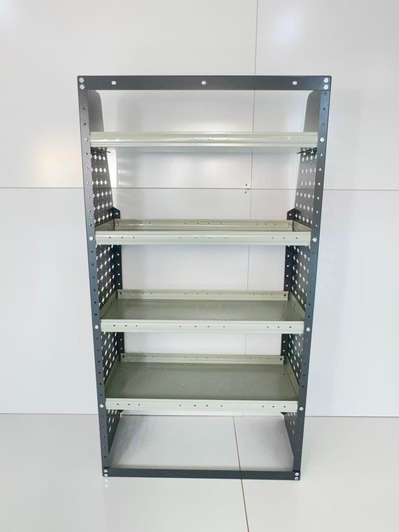 Each of the 4 adjustable shelves can be easily repositioned to accommodate different tool sizes — from power drills and fittings to cables, paint supplies, and toolboxes. The 42.5″W x 46″H x 16.5″D structure fits seamlessly into most standard cargo vans, providing efficient space utilization without blocking access or movement.